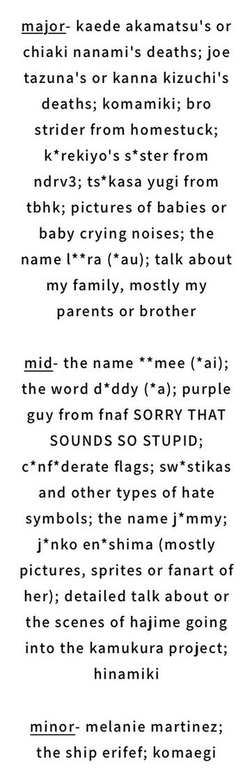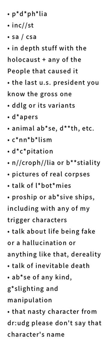 Below is a list of your TRIGGERS. You respectfully ask that people put a warning before posting or talking about any of these things, and/or censor them.